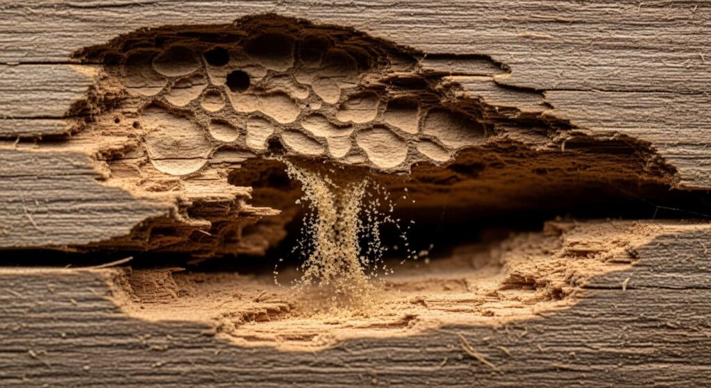 - Les termites : Plus rares mais extrêmement destructeurs, ils dégradent le bois sans laisser de traces extérieures visibles jusqu’à un stade avancé.